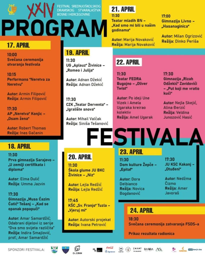 “Ukupno je 12 predstava, ukoliko na računam predstavu “Osam žena” AP “Nerteva” Konjic, koja će biti odigrana prvog dana festivala u 17:30 sati. U subotu, 18. aprila, konjičkoj publici će se predstaviti Prva gimnazija Sarajevo s predstavom “U zemlji certifikata i diploma” u 11:30 sati. Istog dana nastupa i Gimnazija “Musa Ćazim Ćatić iz Tešnja, s predstavom “Kada se opanak po papući u 17:30.